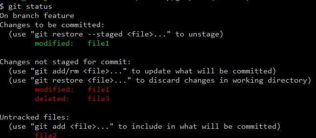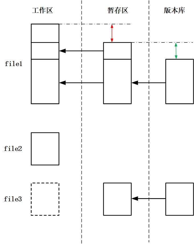 如图所示,通过git status命令可以看到绿色字体以及红色字体的两类不同的文件,绿色字体的”modifiled: file1”对应着上图中file1暂存区和版本库的差异(绿色箭头),而红色字体包含多种情况,上图中file1工作区和版本库的差异(红色箭头)对应着红色字体的”modified: file1”,而file2是在工作区创建了文件,却没有add和commit,于是暂存区和版本库就没有对该文件的追踪,对应着图中”Untracked files: file2”,file3是在add并commit之后删除了工作区的file3文件,对应着图中“deleted: file3”。总之,工作区与暂存区的差异总是红色字体表示,而暂存区与版本库的差异总是绿色字体,具体是属于modified,deleted,还是untracked files类型,则是由产生差异的原因决定。例如modified就是由于文件更改而产生的差异。